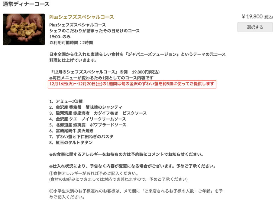 【Plus汐留 12月16日(火)〜12月20日(土)コース内に金沢のずわい蟹がズラリ!!!】